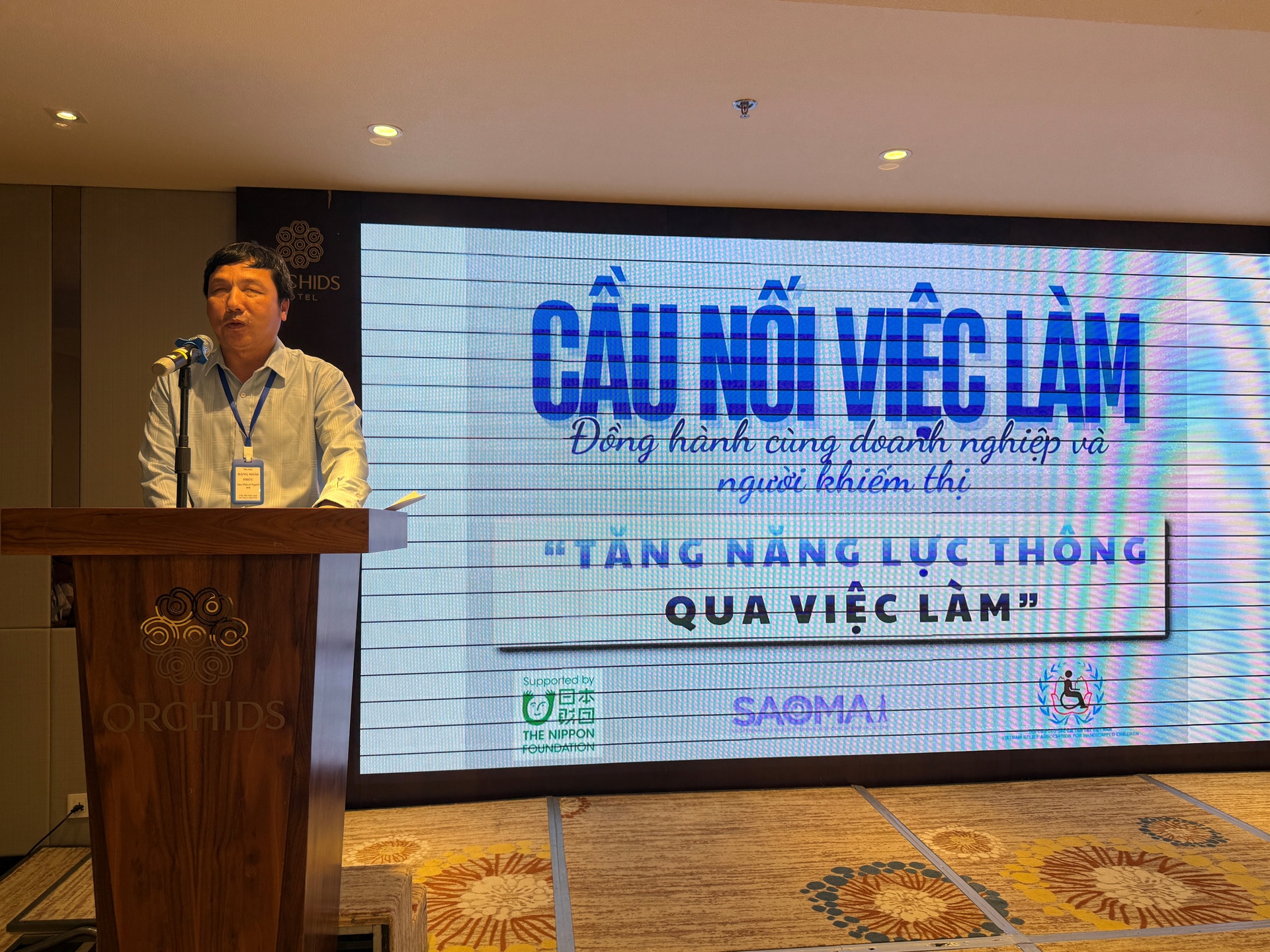 Trong phần khai mạc, ông Đặng Hoài Phúc – Giám đốc Trung tâm Sao Mai – đã trình bày bài phát biểu giới thiệu dự án hỗ trợ người mù tìm kiếm cơ hội việc làm hòa nhập. Ông nhấn mạnh quá trình hình thành, phát triển và mở rộng của dự án, với mục tiêu tạo ra hệ sinh thái hỗ trợ việc làm toàn diện cho người khiếm thị.